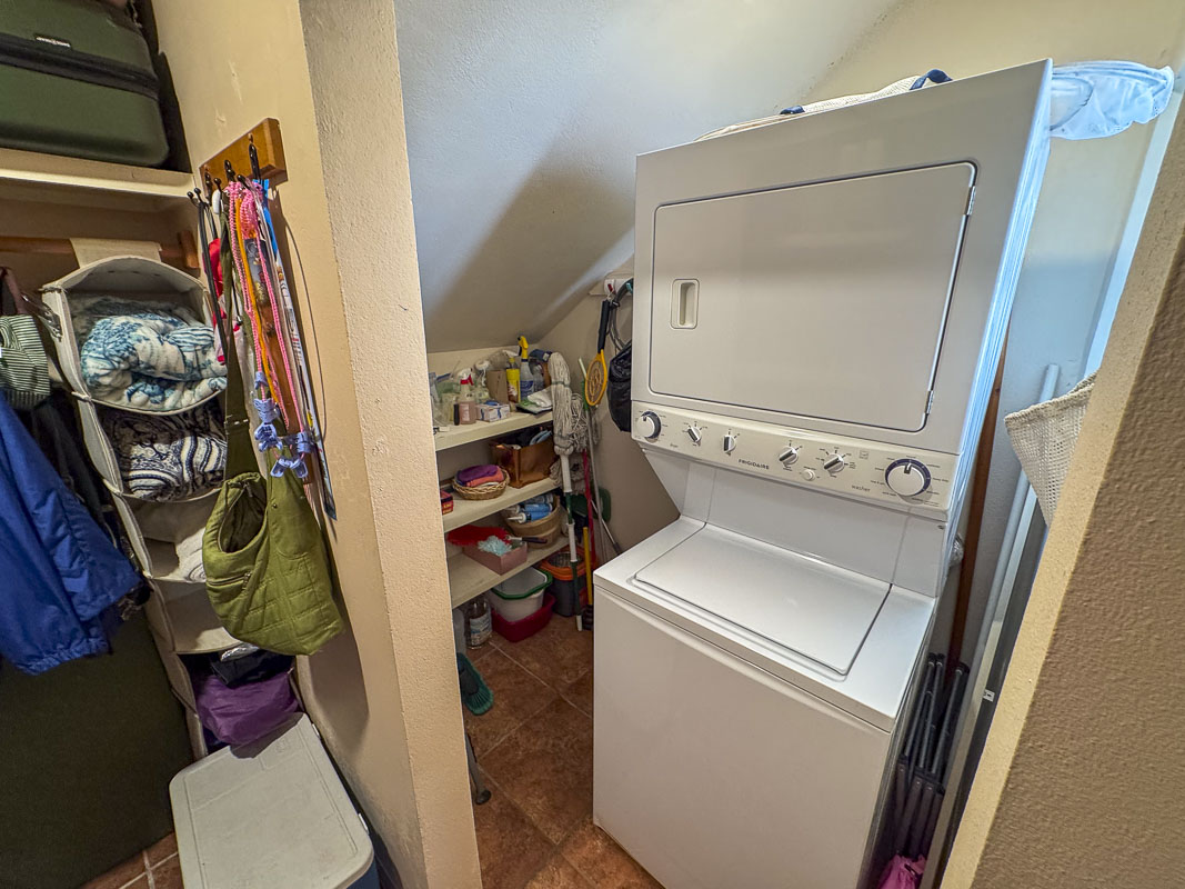 Private laundry room: A spacious laundry room includes a stackable washer and dryer for added convenience.